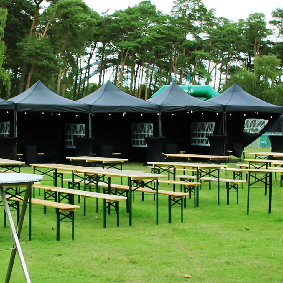 Bucht gebrandete Teamzelte und Tische und schafft euren eigenen Treffpunkt mit Festivalflair direkt auf dem Eventgelände.