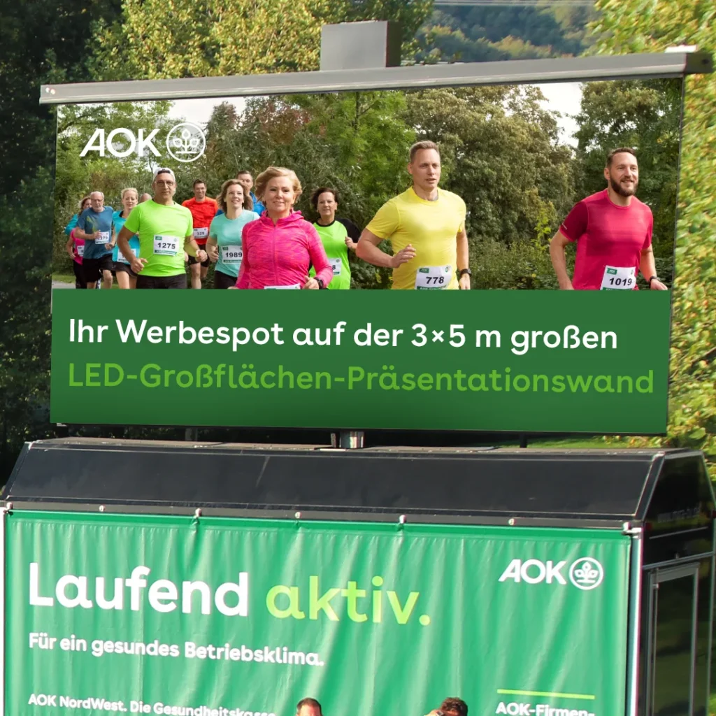 Auf der 3×5 m großen LED-Großflächen-Präsentationswand wird ein 10 Sekunden-Spot präsentiert. Wiederholung des Spots ca. alle 4 Minuten.
